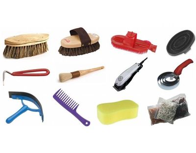 D) Grooming Tools: Soft Body Brushes, Soft Face Brushes, Hard Body Brushes, Rubber Curry Combs, Mane and tail combs/brushes, hoof picks, Fly spray, electric/battery operated clippers